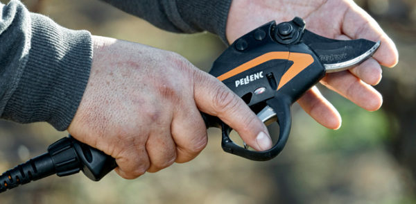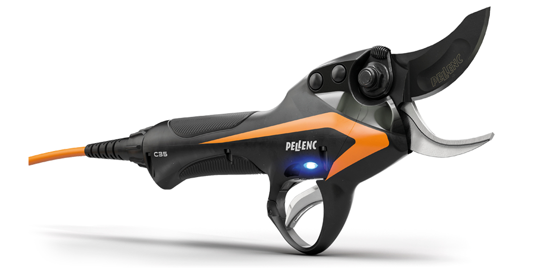 Sistema di protezione antitaglio brevettato che causa l’arresto immediato della lama in caso di contatto con il dito dell’utilizzatore, con o senza guanti PELLENC. BREVETTO PELLENC
